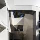 The two nodal patios are layered in white manufactured tile, the first one destined to a service usage and the second one, of double height, complements the living-room ambiance with a gardened mirror pool.