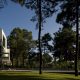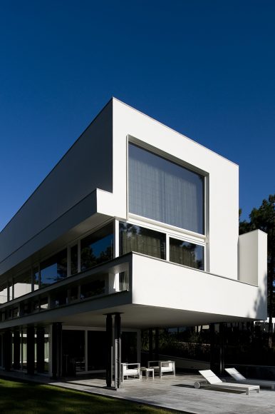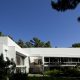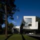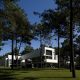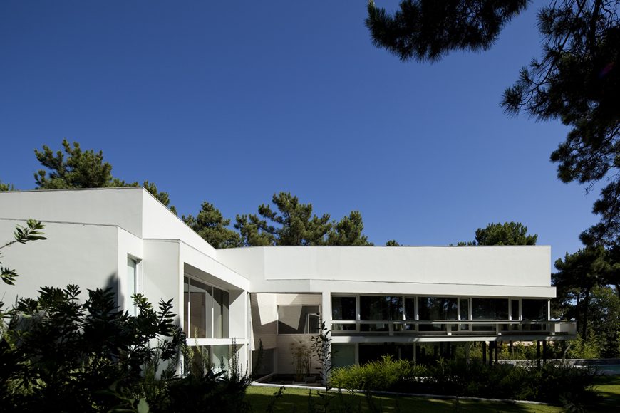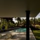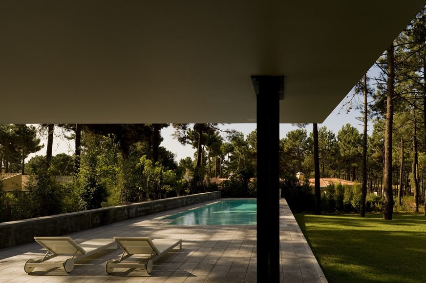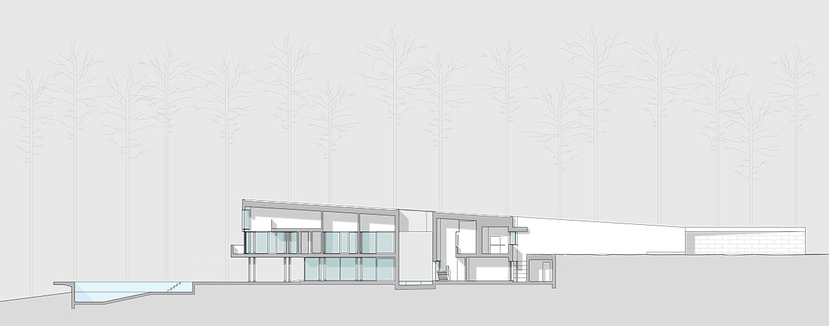 As the natural slope of land goes down, the roof goes up, and the house shifts from a ground-based situation to a floating one, supported by the delicate metal columns and drawing a trail across the garden down to the pool.