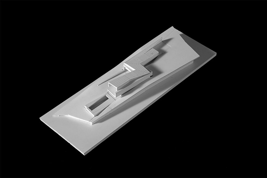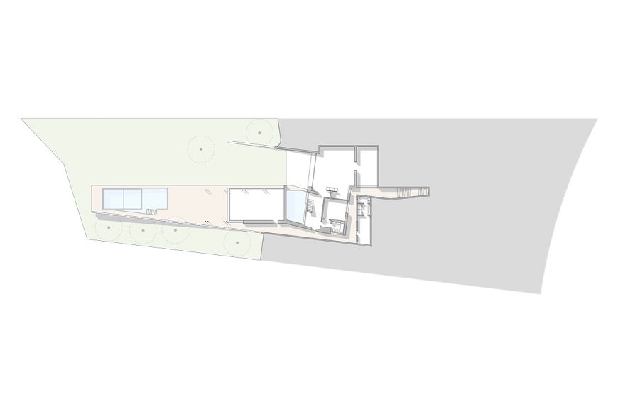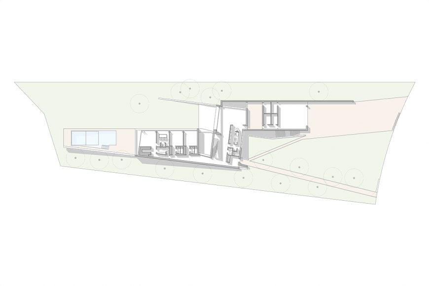 It has assumed a serpentine shape, sliding across the slope, leaning whether to one longitudinal limit or the other, assuring privacy where needed and allowing the enjoyment of the landscape when wanted.