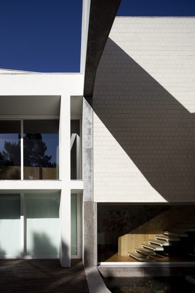 The house consists on three continuous bodies, articulated by two patios. The first body is longitudinal to the entrance and is used as garage and working area. The second is transversal and comprises the common life of the house, the kitchen and living-rooms, overlapped in two storeys, opening up to the landscape.