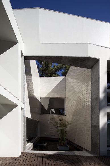 O último é novamente longitudinal, de um só piso (suspenso) e é ocupado pela zona de quartos. Os dois pátios são revestidos a azulejo artesanal branco, sendo que o primeiro de dupla altura, complementa o ambiente da sala num espelho de água.