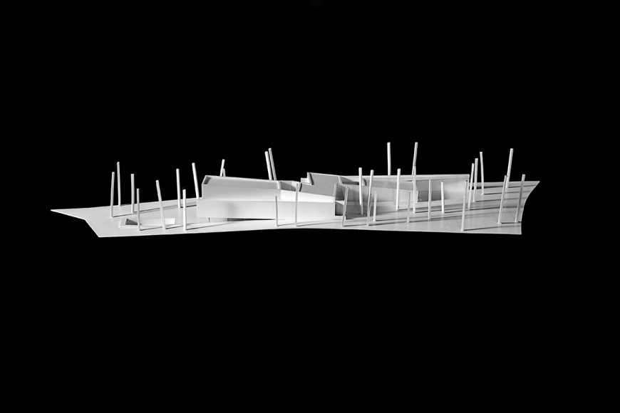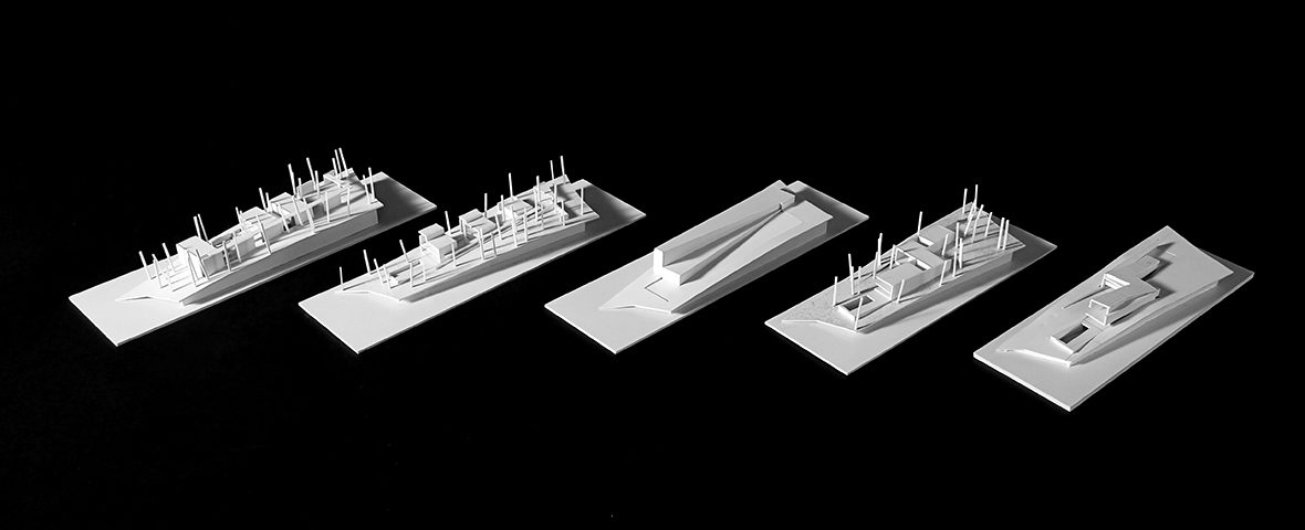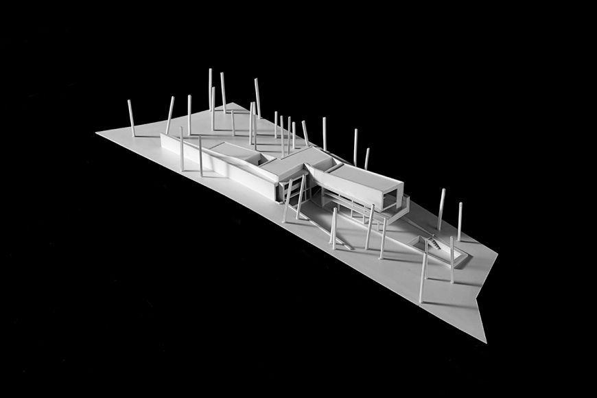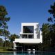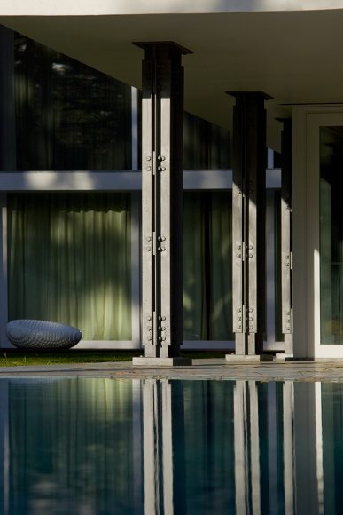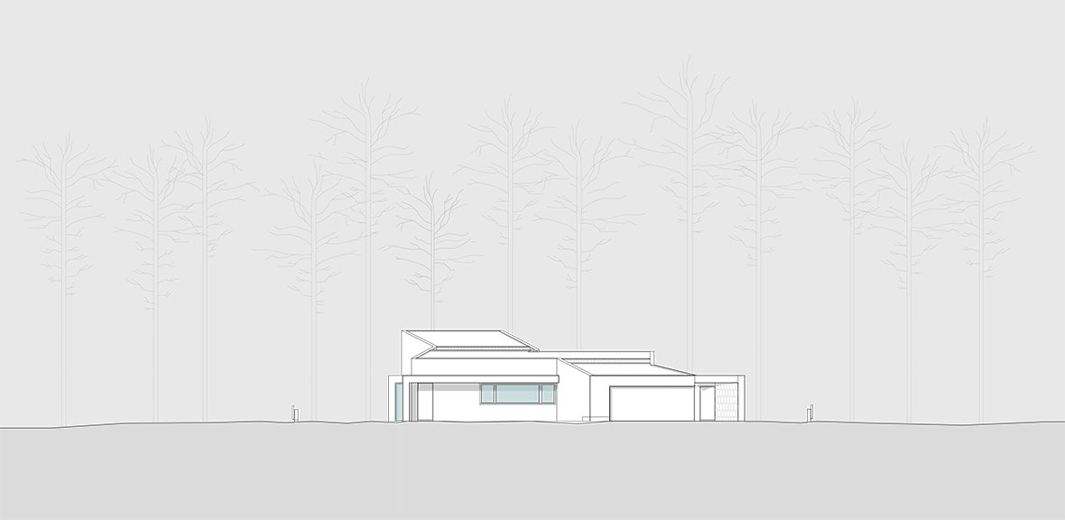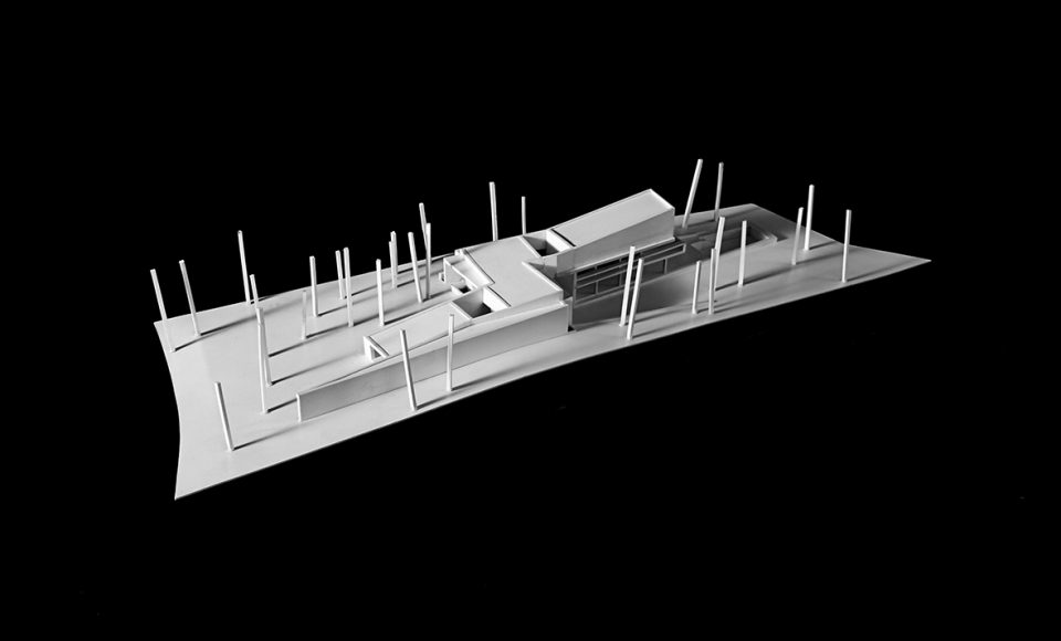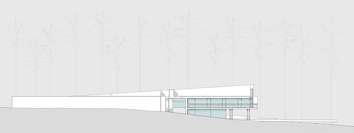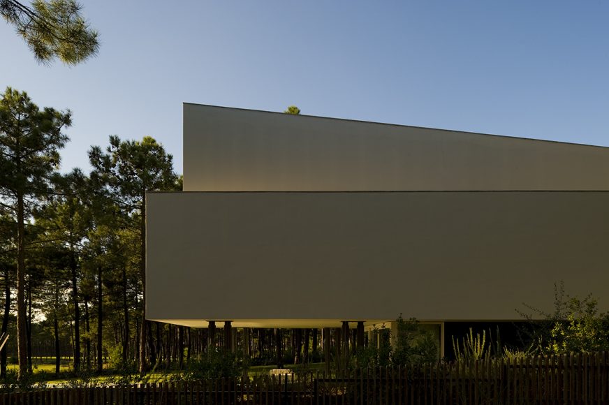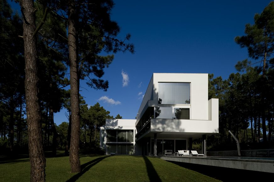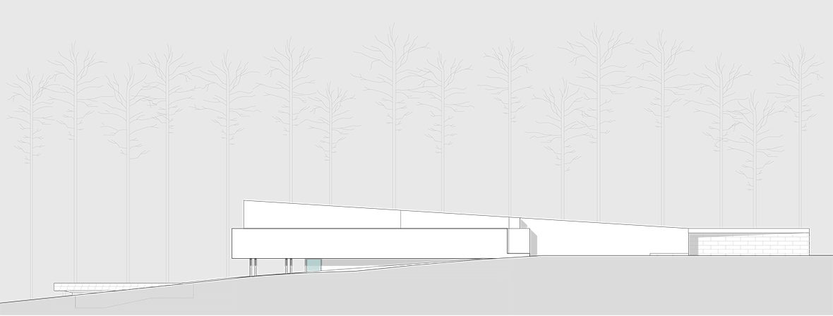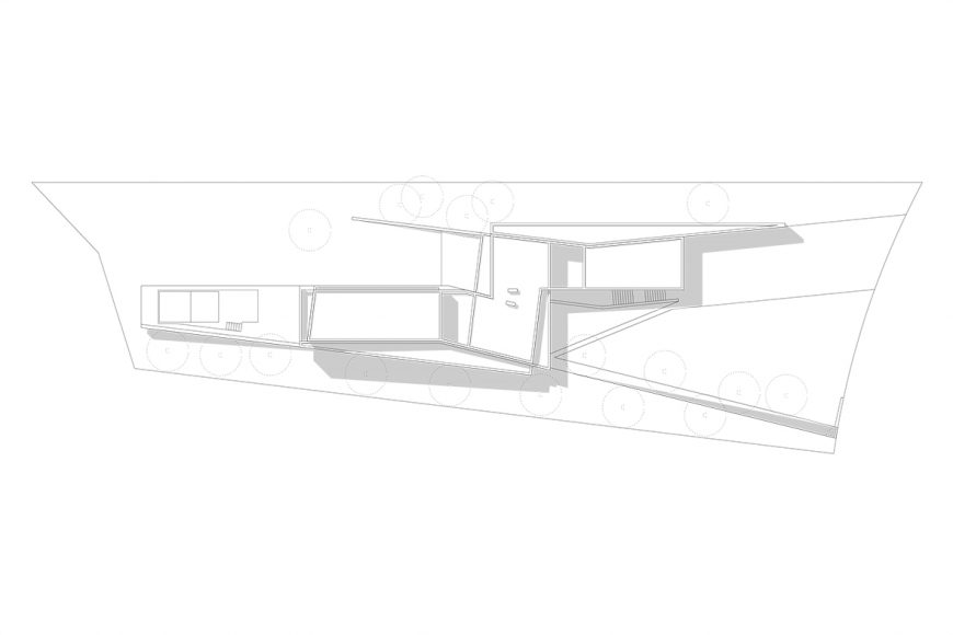 O desenho da casa centrou-se na relação que esta estabelece com a topografia e com a paisagem distante, assumindo, por isso, uma forma serpenteante, que “desliza“ na pendente, encostando-se ora ao limite longitudinal ora ao outro, de forma a garantir privacidade. Enquanto o terreno natural desce, a cobertura sobe e a casa transita de uma situação apoiada no terreno para uma condição levitante, sobre delicados pilares metálicos que marcam um percurso do jardim até à piscina.