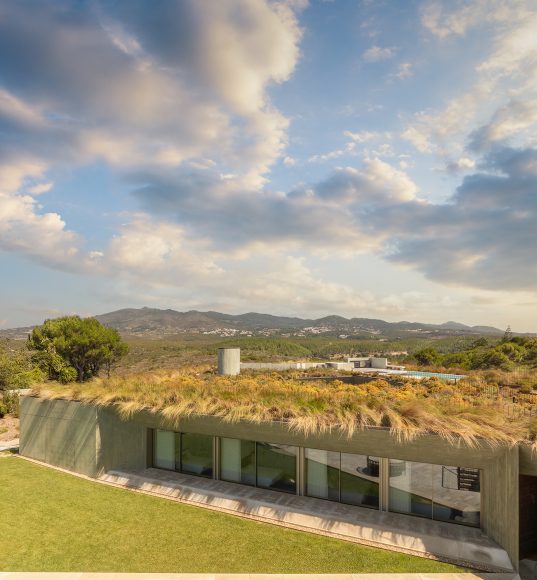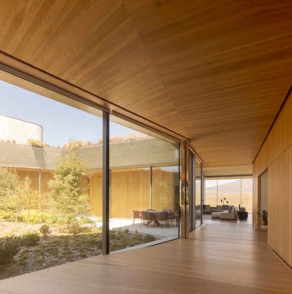 Given the demanding weather conditions in this area of Guincho, the volume of the house is excavated inside, defining two large courtyards in the heart of the house. This option intends to capture for its epicenter an important fragment of natural space, around which life articulates and unfolds, but already in a condition protected from the harsh northwest winds and serenely open to the south. The rocky outcrops are naturally integrated and the vegetation is extracted from the native flora as if in plant continuity with the terrain. Its contour walls are fully glazed, to provide this coexistence with nature, and the floors and interior walls facing the patios are in exposed wood, giving a fuller expression to this context.