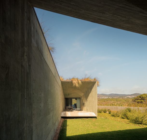 Conceptually, it evokes the tutelary presence of the defensive buildings that dot this area of the coast, forts, bastions and watchtowers, which dot the wider territory in which this house is inserted and which in some way respond to a close vigil relationship between the land and the sea.