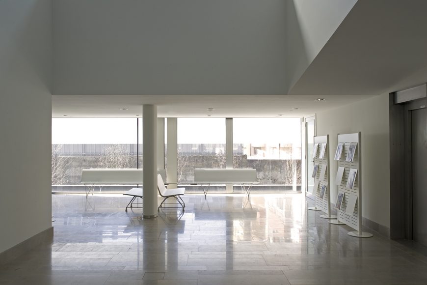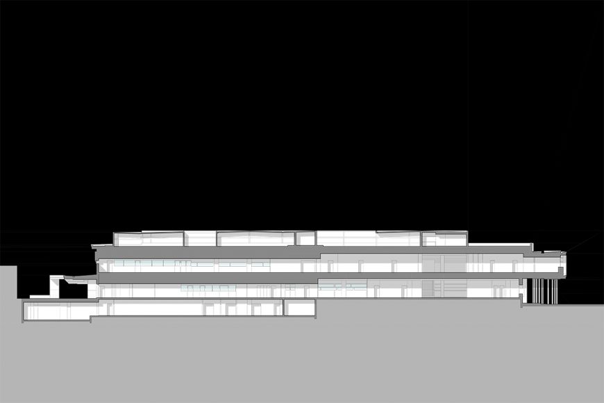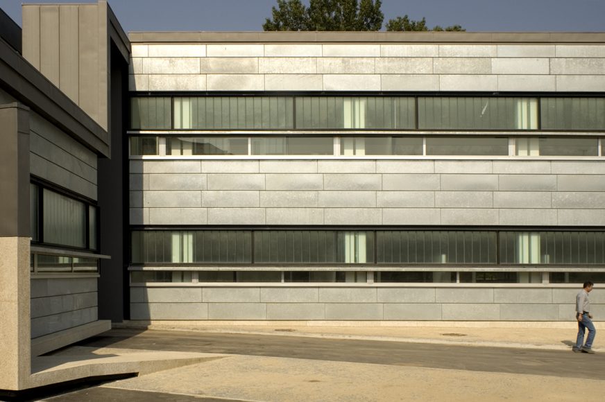 There is no fixed relationship between the content and the container: on the exterior the vertical variation of the window mullions reveals its autonomy from a particular interior layout. Inside materials are always the same, to promote easiness for layout alterations.