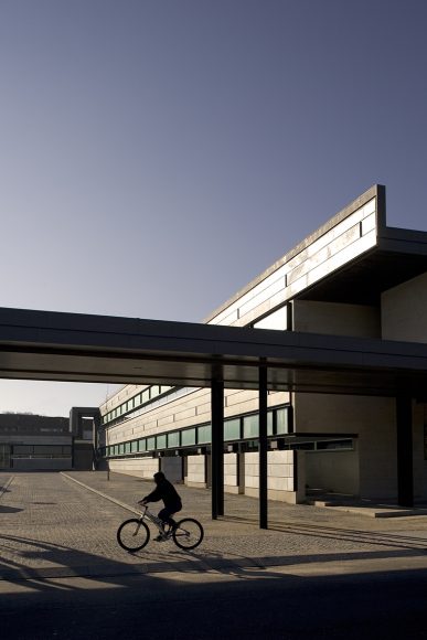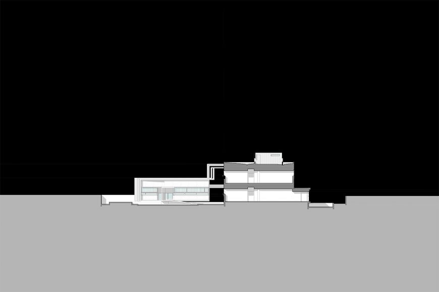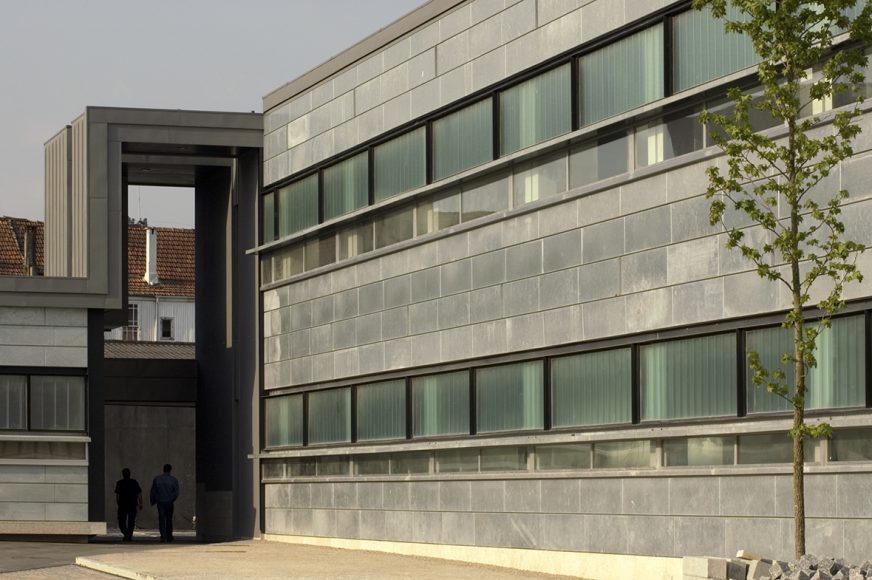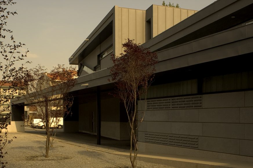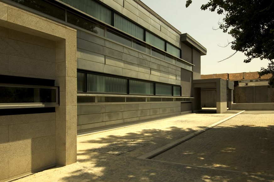 The building-as-line runs through the polygon´s different directions searching its geometry. Along its apparent motion, it comes to stability as different segments of variable conditions: thick and sitting on the ground, floating and thin. The extremities touch the streets gently: the building is lifted on Bolama str. announcing the main (public) entrance’s obvious permeability, peeking over the Covelo Park wall across the street; on the opposite end (Visc. Setubal str.) it becomes a technical arch (service entrance) cutting through the renovated granite wall of the old farm.