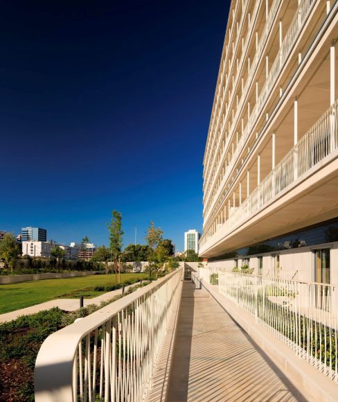 The internal organization of the housing program directs most of the common areas of the homes to the south, in order to allow wide, diaphanous and fluid spaces, characteristic of a contemporary way of living, to relate to the city. This approach gives the building a sense of transparency and lightness, protected by a metal skin of vertical posts, railings and screens that give intimacy to the balconies and apartments. On the rear façade, the elevation uses more specific openings that protect private spaces from visual and noise pollution, while still allowing the enjoyment of external spaces over the garden.