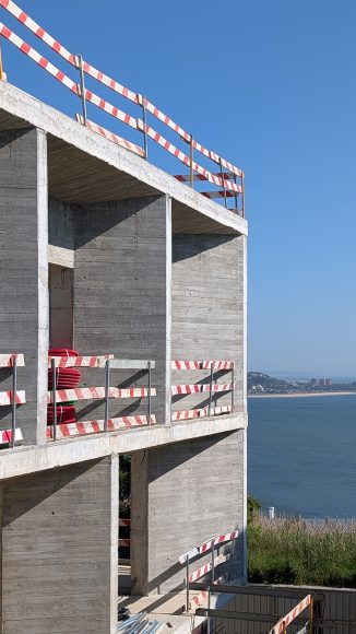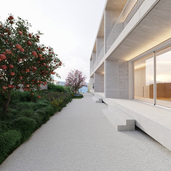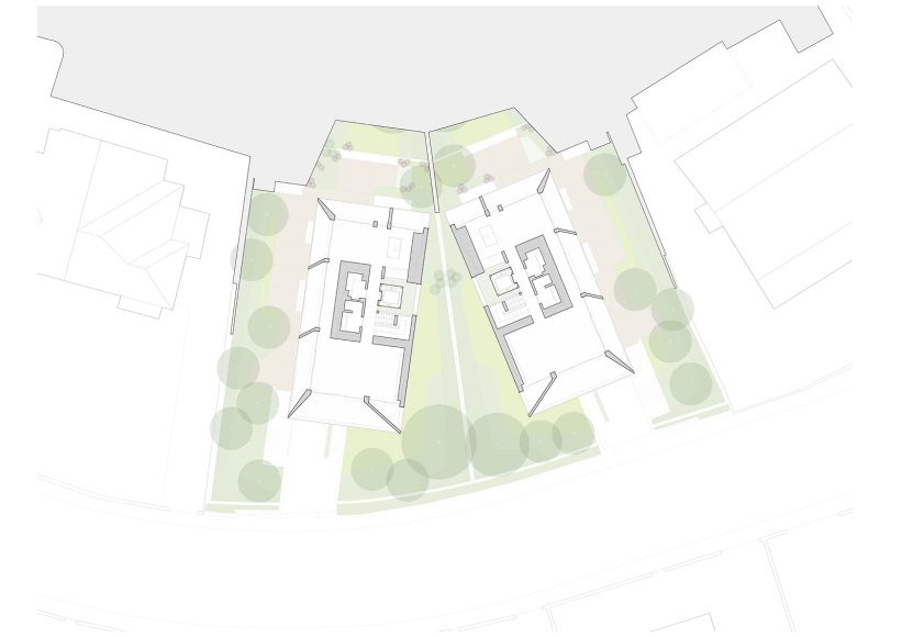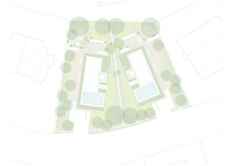 É assim que nascem duas casas gémeas abertas sobre a paisagem a 270º, que se relacionam de maneira distinta com a envolvente, através de varandas individualizadas por paredes cujas inclinações refletem a luz solar, e direcionam o olhar tanto para segmentos de horizonte como de diferentes partes dos jardins envolventes. Em alternativa e aproveitando a necessidade de se criar paredes de contenção para ajustar as diferentes cotas do terreno, a zona norte do terreno oposta à vista panorâmica, será modelada para criar uma espécie de pequeno pátio, que surge como uma extensão exterior da cozinha e da sala de jantar.