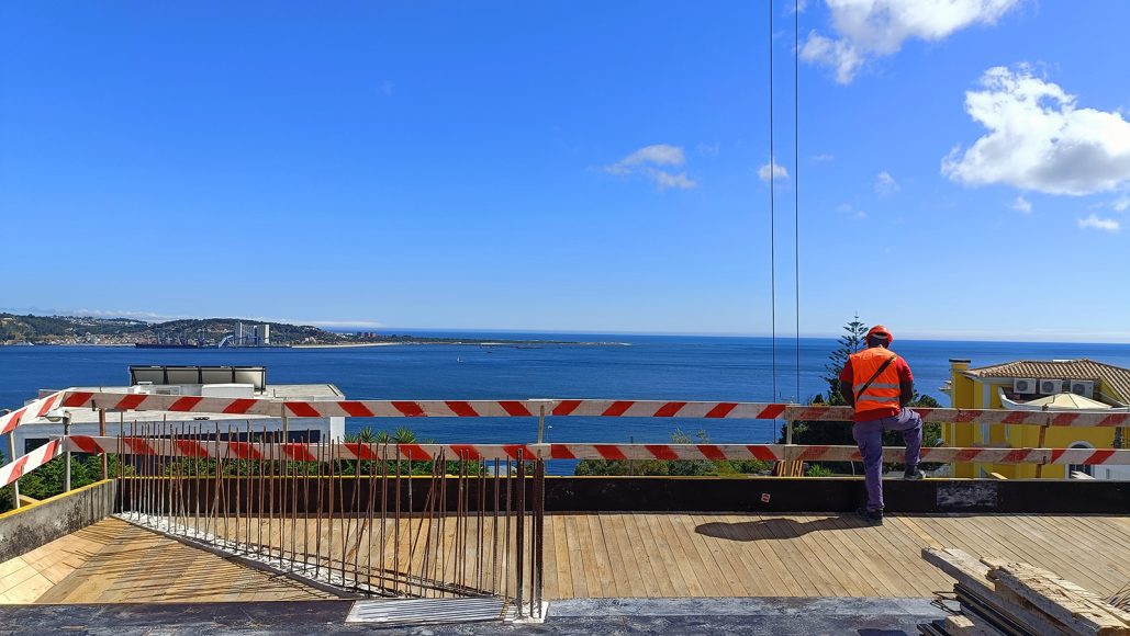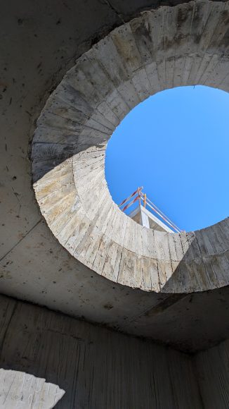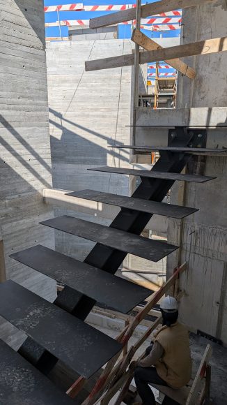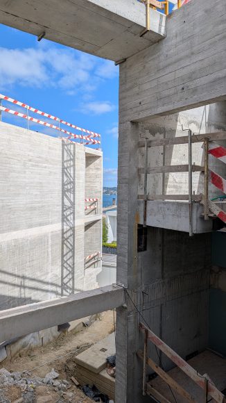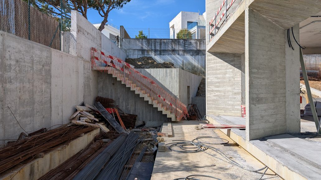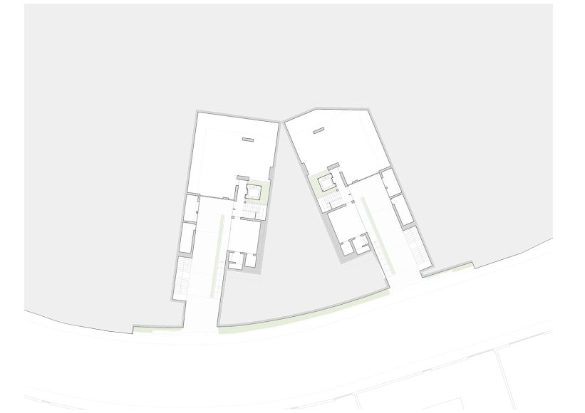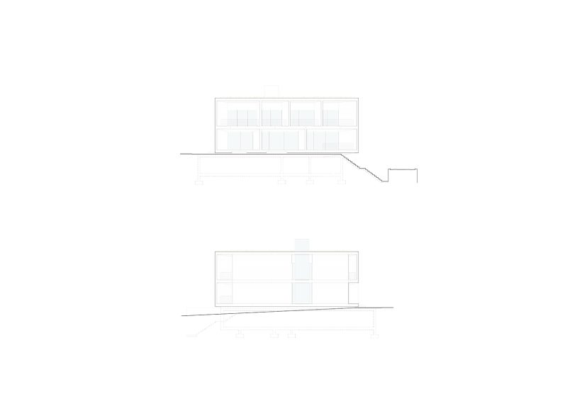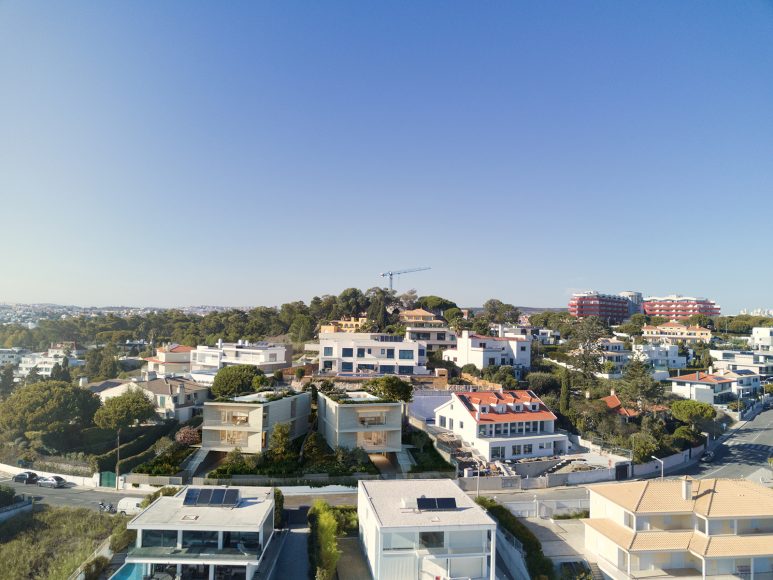 Estas condições conduziram a uma estratégia de desenho de duas moradias, que ganha forma entre uma vontade “obsessiva” de abrir as vistas sobre a envolvente, e uma fruição das plataformas de jardim que acompanham os vários pisos. Naturalmente que, a par desta vontade, está também o desejo de proteger a intimidade do espaço interior e da vida dos moradores, tentando encontrar um equilíbrio entre privacidade e imersão completa na paisagem. É disso exemplo a implantação das duas moradias em “V” no terreno, e, tendo em conta a sua proximidade, o facto de o alçado mais próximo ser completamente cego, com exceção da presença de um pequeno pátio vertical. Além de conduzir a luz natural até ao nível inferior – garagem e áreas de serviço – e às áreas de circulação, este pátio acomoda também um elevador envidraçado que permite manter a passagem de luz e que, além da escada, assegura a ligação direta deste o nível -1 ao terraço superior.