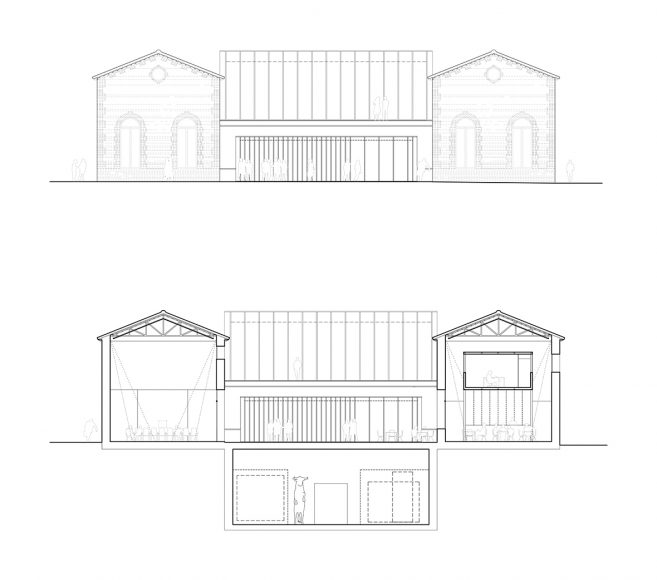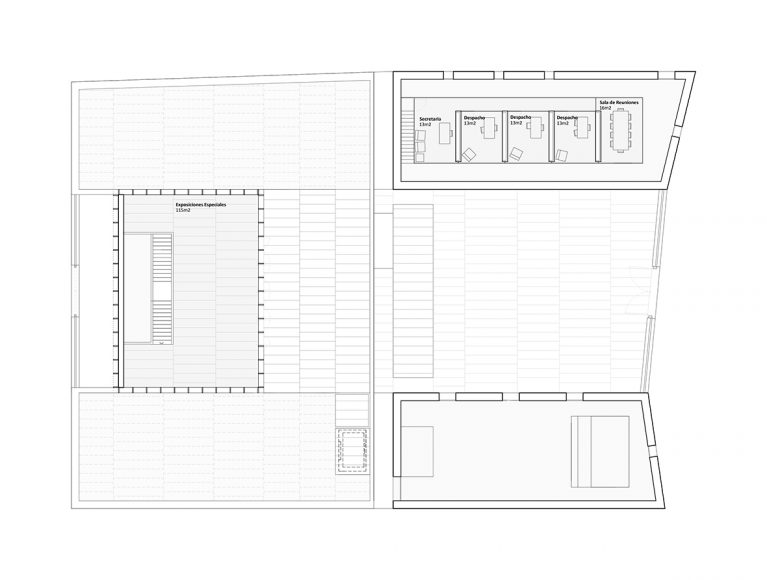1. No térreo, um grande átrio exterior, definido pelos dois edifícos pré-existentes e pelo corpo novo que os interliga, recebe os visitantes. As antigas naves contém as funções programáticas autonomizáveis, nomeadamente o auditório, a loja, a cafetaria e a mediateca. O volume proposto alberga as exposições temporárias, divididas em três grandes salas.