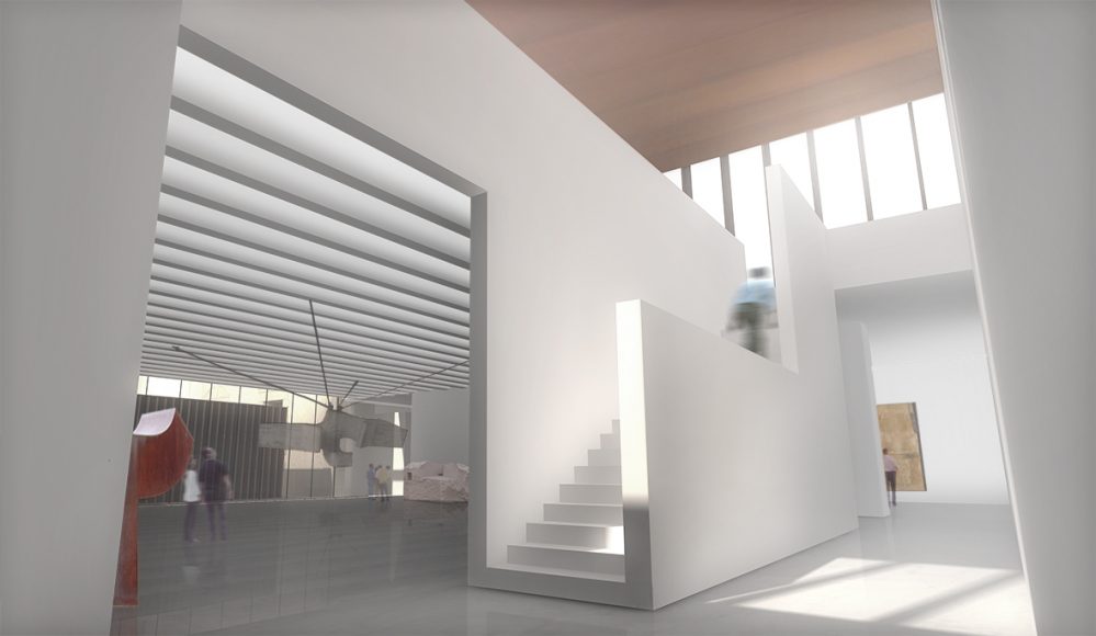 3. Na cobertura, um espelho de água refresca o ambiente – aludindo a uma estratégia de raíz islâmica – e reflecte as naves existentes nesta nova ala. O volume “farol” estende-se visualmente à paisagem e possui um carácter flexível, podendo destinar-se a exposições especiais, às “vernissages” e “finissages”.